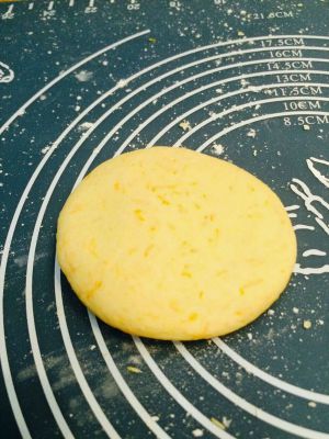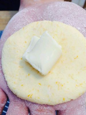 搓圆压扁后,中间放入1/4片芝士片后,握起来用面团把芝士包在中间