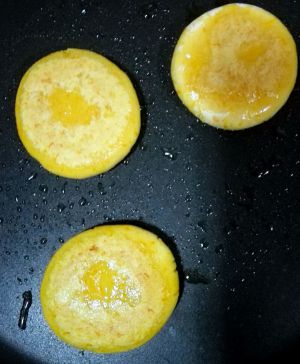 冷锅,冷油,小火煎至两面金黄,注意要全程小火,基本上软了就熟了(速冻的也一样冷锅,冷油小火煎)