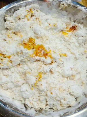 把南瓜、粉、糖等拌匀和成团