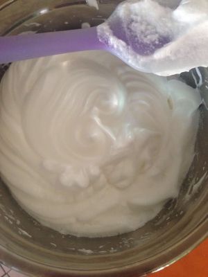 蛋清加入数滴柠檬汁用电动打蛋器低速打至粗泡后加入少许细砂糖,然后开高速打至蛋清能拉出小弯勾后再加入一半细砂糖,这时候建议用刮刀把溅到边上的蛋清刮下,再打至泡沫细腻加入剩下的砂糖,转低速打至能拉出直的小勾
