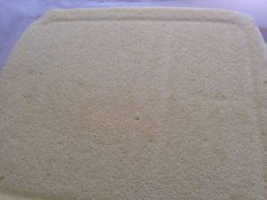 烘烤完成后,撕掉蛋糕底面的油纸,再在表面盖一张油纸避免风干。晾到温凉后,在蛋糕下面铺一张比较长的油纸,将蛋糕四边切掉。
