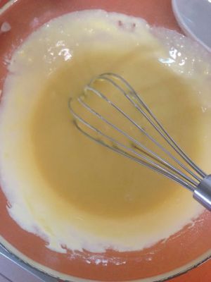 把三分之一打发好的蛋白,放入蛋黄糊中。