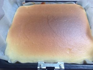 烤箱提前预热,烤盘铺上油纸后倒入蛋黄糊抹平,中层150度,烤约25~30分左右,表面呈金黄色