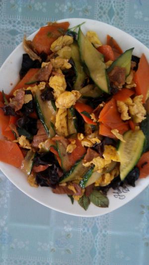 鸡蛋炒好,先盛出来。少油入锅,葱蒜爆香,依次炒胡萝卜、肉片、木耳,七八分熟放入鸡蛋。勾芡调味,翻炒后出锅!