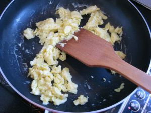 锅中热油,放入葱白炒香,鸡蛋直接打入锅中,用筷子搅拌