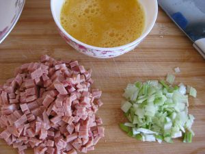 午餐肉和葱切成末,鸡蛋加一点点盐打散。