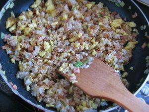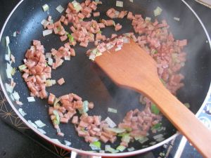 不用再倒油,把午餐肉和葱大火炒出香味。