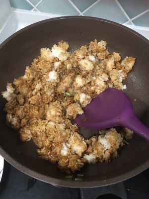 米饭下锅翻炒,加入老抽、蒸鱼豉油翻炒拌匀