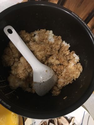 主料:米饭,海参(不一定是这个,可以是肉粒)配料,半汤勺糖,半汤勺老抽,一汤勺生抽(视米饭多少,米饭多多加点生抽)一勺料酒,半勺花生油调成酱
