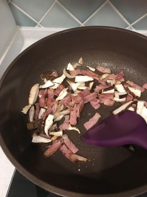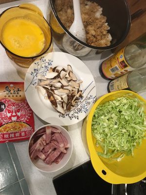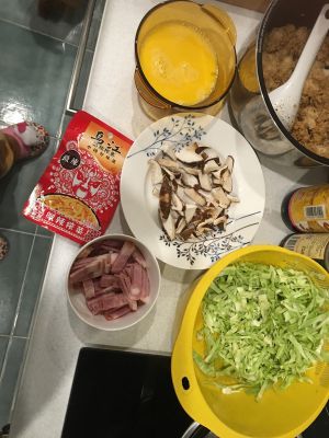 培根切小块、圆白菜切丝、香菇切段、鸡蛋打散备用