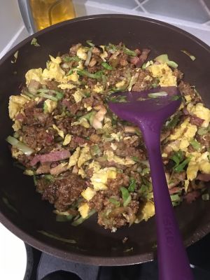再倒入一点油润锅,倒入火腿肠,炒出香味,倒入拌好的米饭!继续炒!(炒啊~炒啊~炒啊炒