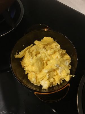 锅中倒入少许油,将蛋液炒成鸡蛋碎粒后盛出。
