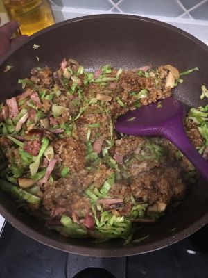 然后加入圆白菜和榨菜翻炒断生,盛出备用。因为培根和榨菜都有一定咸度,所以暂时不用调味