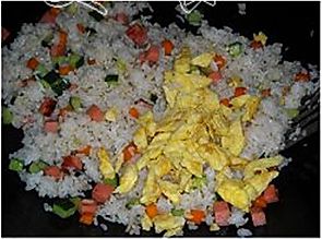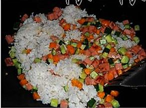配料炒好要盛出来,再炒米(炒米时打里一个鸡蛋,这样炒米时不粘锅,出来的米比较散)