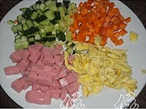 鸡蛋打散煎熟铲碎,黄瓜、胡萝卜、放腿肉分别切小丁;