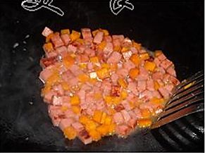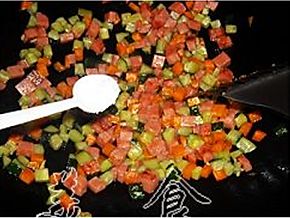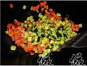 放进胡萝卜丁,煸炒至胡萝卜变软;