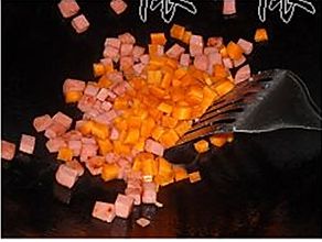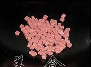 锅中刷一层薄油,热油锅,放进方腿丁煎至稍带金黄;