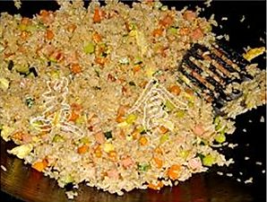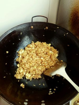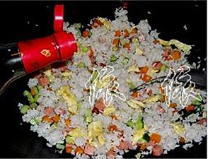 倒入事先搅拌好的酱油,翻炒。注意酱油一定要划圈洒在米饭上。不可沿锅沿倒入,因为锅烧热后酱油蒸发快。