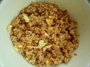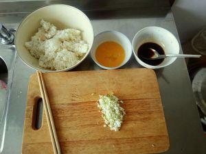 刚煮熟,冷却两个小时的米饭,最好隔夜饭。 将两勺酱油,一勺老抽(主要为了上色),一小勺油,一小勺白糖,一小勺料酒跟米饭搅拌均匀。 然后正常炒蛋。