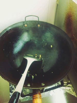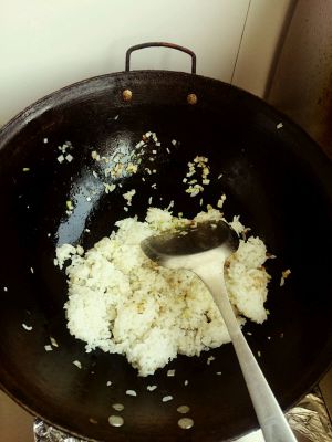 蒜,干辣椒爆锅,倒入米饭。 不停翻炒米饭(要不容易糊锅),最后加入适量耗油,盐。