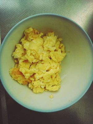 待锅烧热后,倒油,炒鸡蛋,鸡蛋微熟就可以。取出,装碗备用。