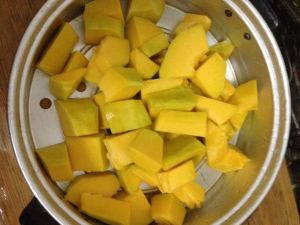 将南瓜洗净,切小块儿,然后蒸熟至变软。