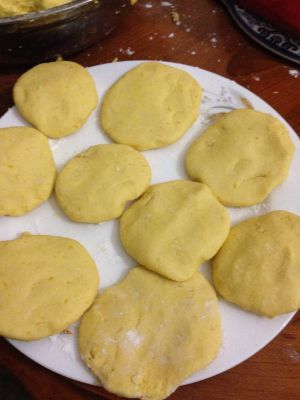 用手蘸点糯米粉,捏成饼状就可以下油锅啦