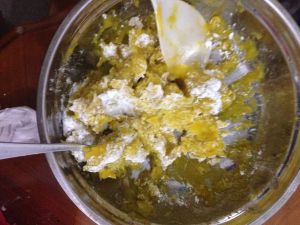 将南瓜放入盆中加面粉盐搅拌加水搅匀
