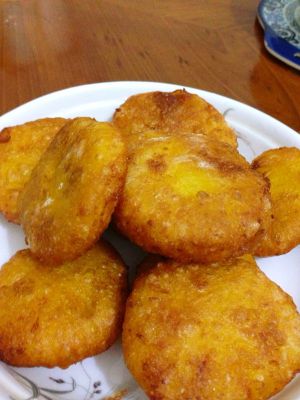 热锅,倒入适量花生油小火烧开,再放入南瓜饼慢火煎至金黄色。(PS:切记要小火煎南瓜饼,否则会很快糊掉。)