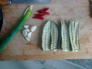 取出茄子,用刀分成两半,底部不要切段,茄肉划上几刀。