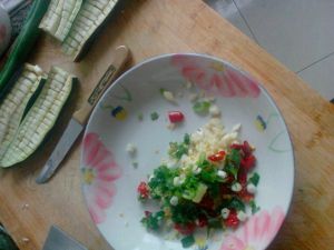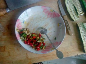 边烤茄子,边准备酱料。姜蒜剁碎,小米辣切小圈,葱切末。小火倒入盐搅均匀,油热了后加入姜蒜末、葱头爆香