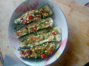 茄子竖着从中间劈开不切断,蒜切沫,香菜,小米椒切碎,锅内热油,放入蒜末翻炒一分钟,连油一起盛到碗内,接着在碗内倒入生抽,耗油,白糖,盐,一点点豆瓣酱,少量辣椒酱,放入香菜,搅拌均匀。茄子放在锡纸上,用刷子涂一层油,待茄子烤到快软了的时候,把酱料涂抹均匀,再烤五分钟即可。