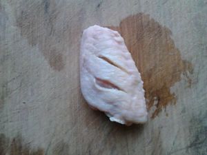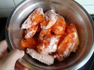鸡翅洗净,正反切三刀,方便入味,奥尔良腌料放入洗净的鸡翅中,加少量水,用小手给鸡翅按摩,均匀抹上腌料,放到冰箱,腌8小时。