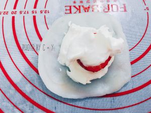 从冷冻室取出面团,分割成35g左右的小面团,揉圆擀平,包裹上打发好的奶油,中间倒放一颗草莓(去蒂去底部)揉圆,也可以像我一样揉成自己喜欢的形状。