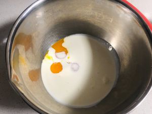 加入两个蛋黄,用搅拌铲就可以,将蛋黄搅拌均匀哟!