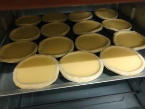 因为太简单了,没拍过程图。第一步把淡奶油、牛奶和糖放到小锅,坐进热水锅小火加热,不停搅拌。冒泡了就取出;一定要等奶液完全凉了再放蛋液否则蛋黄就烫熟了,卖相跟摊鸡蛋一样不好;蛋黄分开搅拌成蛋黄液之后加入奶液,再加入吉士丁粉不停搅拌;吉士丁粉我没过筛觉得麻烦,反正之后还是要过滤蛋液;吉士丁粉搅拌之后表面会有像西米露一样的小颗粒,这就需要过筛了。把液体分次倒入过滤网,过滤的时候用搅拌棒在滤网不停搅拌画圈,通过和过滤网的摩擦力将未融的吉士丁粉融入,这个步骤不能忽略。全部过滤之后就可以装挞皮了。八分满,这个量刚好做8个。