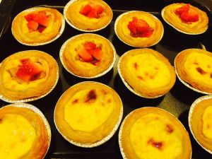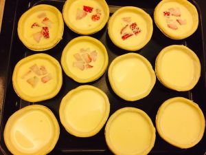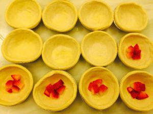 做原味的就直接加蛋奶液到8成量就可以,如果需要做草莓的,黄桃的,直接切小块放进蛋挞皮里,再加蛋奶液至8成量!