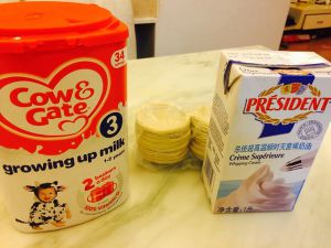 准备好材料,由于我家小朋友临时要吃,家里又没有纯牛奶了,只好拿出我女儿的奶粉来充当啦!味道一样赞哦!