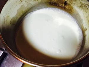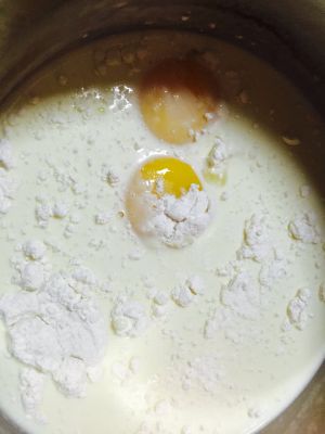 鸡蛋黄6个最好分离,搅拌均匀加入事先弄好的奶锅里,记着加鸡蛋液时候一定要搅匀边倒边搅拌!