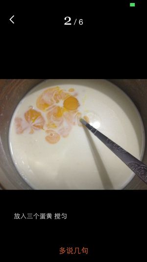拿3只鸡蛋,取出蛋黄加入到之前做好的奶液中并搅拌均匀,这样蛋挞液就做好了
