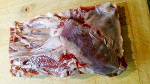 牛腰剪开,一片剪成四块,方便烤制。也可在腌制之前剪开。
