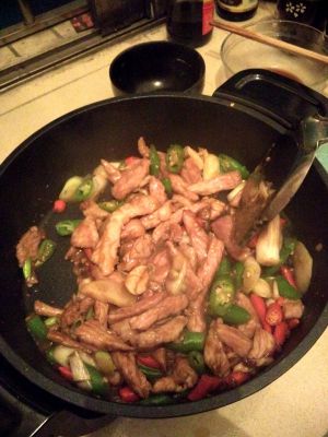4、2匙调和油入锅,加青尖椒红尖椒,翻炒1min,再加已炒至7成熟的五花肉、姜丝,继续翻炒。其间,放老抽1匙、蚝油1匙。待肉全熟,放盐和味精起锅入盘。