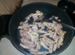 最后放入腌好的瘦肉片,略炒半分钟, 点一些老抽(3ml), 出锅装盘即可。