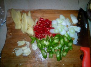 爆好后放豆瓣一勺,加入葱姜蒜翻炒两下
