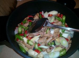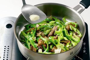 五花肉不出锅,即刻倒入切好的尖椒片和蒜片,放入盐(4g)、鸡精(4g),继续翻炒两三分钟。