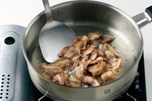 冷锅放油,大火烧热锅中油,待油温达到6 成,放入带皮的五花肉片,反复煸炒,待五花肉中的肥油一部分被煸出,五花肉片变成金黄色。