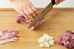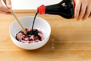 将瘦肉切片,拌入盐(2g)、鸡精(2g)、黄酒(5ml)、老抽(2ml)、生粉,抓匀,腌制5分钟左右。