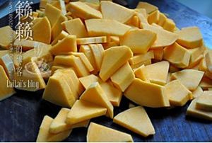 南瓜切薄一片,放进蒸锅蒸熟(切片比较容易熟)