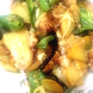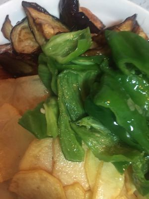 锅热油,倒入土豆煸炒,再依次放入青椒和茄子,加少许老抽、生抽、盐、鸡精和糖调味。