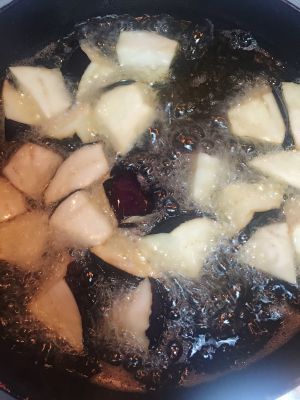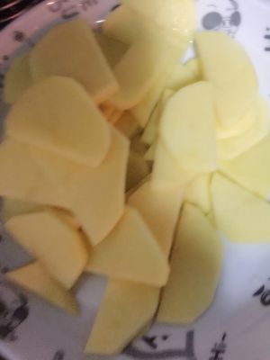 2.油温高一点土豆茄子块过油到金黄色。(因为茄子吃油过多,建议茄子沾上干淀粉,)